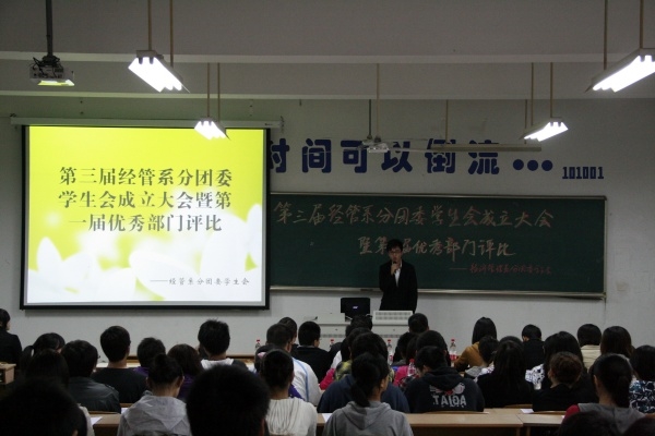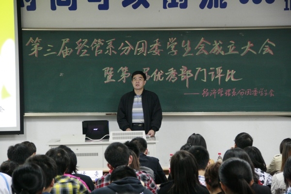 2010年10月14日下午4:30,第三届经济管理系分团委学生会成立大会在文昌院103教室顺利召开。参加本次大会的领导有经济管理系党总支书记黄苏宁,分团委书记羊栋。