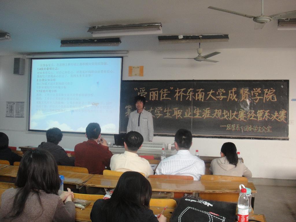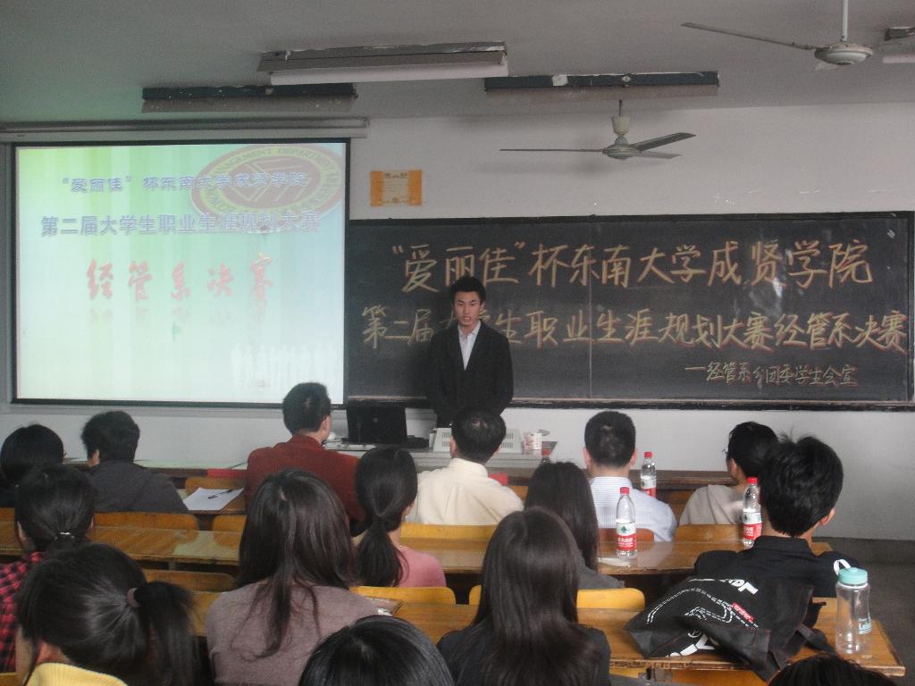 2011年4月28日,下午四点整,在成贤院513,由经济管理系分团委学生会主办,学习实践部承办的太阳成集团tyc33455cc官网第二届“爱丽佳”杯职业生涯规划大赛经济管理系决赛系决赛拉开帷幕。莅临本次比赛的嘉宾及评委老师有经济管理系党总支书记黄苏宁老师,经济管理系学办副主任李清源老师,经济管理系分团委书记羊栋老师,,母雪梅老师,徐小瑛老师,李桂清老师,以及南京业祥科技发展有限公司市场总监、转折号(中国)教育咨询有限公司特聘讲师许金金先生。