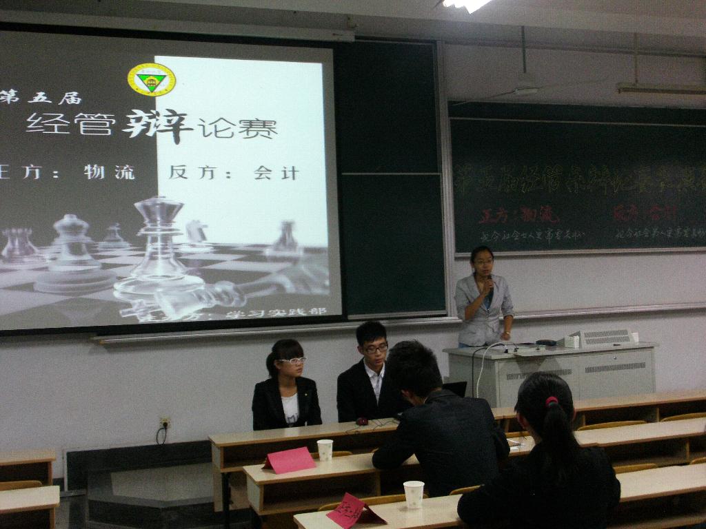 2012年10月11日16:00,经济管理系在文昌院403举行了第五届经济管理系辩论赛的首场表演赛,出席的嘉宾有经济管理系分团委书记羊栋老师,物流专业辅导员章博炜老师,第五届经济管理系分团委副书记朱芮萱,学生会主席陆丹丹,江苏省独立学院大学生辩论赛邀请赛冠军薛珺以及各参赛选手。