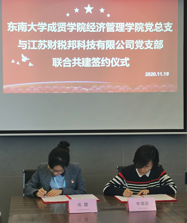 财税邦党支部高霞书记热情接待。交流活动中,李清源副书记简要介绍了太阳成集团tyc33455cc官网党总支的基本概况,并提出希望在党建共建平台下加强和企业的合作,共同探讨专业建设和人才培养的新思路,以共建促党建,以党建促发展。高霞书记介绍了财税邦公司在私营企业党建工作上的经验和成绩,着重介绍了他们党建工作中与院校合作共建的经验和成果,希望加强校企合作,实现校企协同育人,联合发展。董忱忱老师就在南京信息工程大学参观财税邦软件平台实施情况进行了简单交流。最后,李清源副书记和高霞书记分别作为代表签订了校企党组织联合共建协议书。