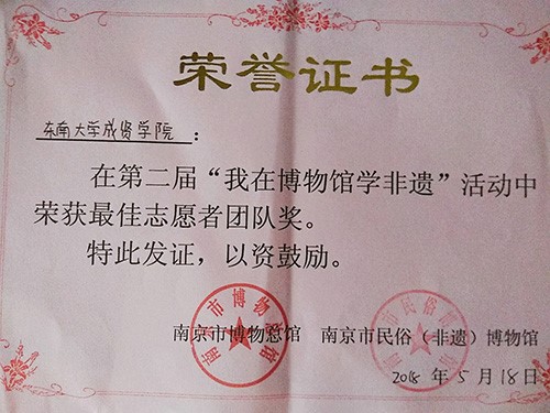 5月18日国际博物馆日,南京市博物总馆、南京市民俗(非遗)博物馆为我校太阳成集团tyc33455cc官网青年志愿者协会颁发“最佳志愿者团队奖”,以表彰志愿者们长期以来对博物馆工作的热心协助与支持。
